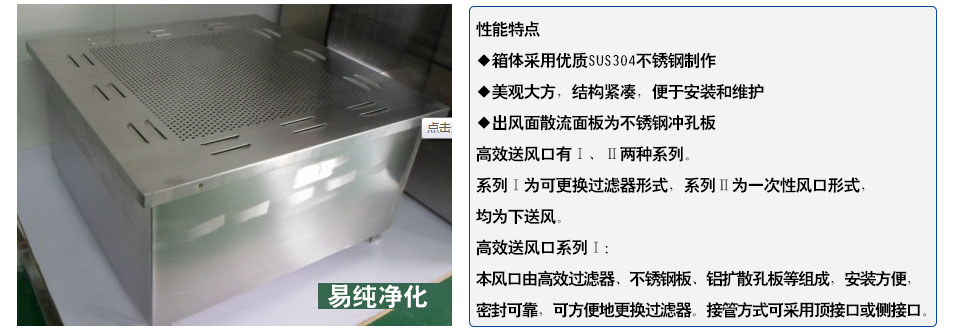 高效送風(fēng)口為千級(jí)、萬(wàn)級(jí)、十萬(wàn)級(jí)凈化空調(diào)系統(tǒng)較為理想的終端過(guò)濾裝置,可廣泛于醫(yī)藥、衛(wèi)生、電子、化工等行業(yè)的凈化空調(diào)系統(tǒng)。高效送風(fēng)口是用作改造和新建1000-300000級(jí)各級(jí)潔凈室的終端過(guò)濾裝置,是滿足凈化要求的關(guān)鍵設(shè)備。高效送風(fēng)口包含靜壓箱,散流板,高效過(guò)濾器,與風(fēng)管的接口可為頂接或側(cè)接